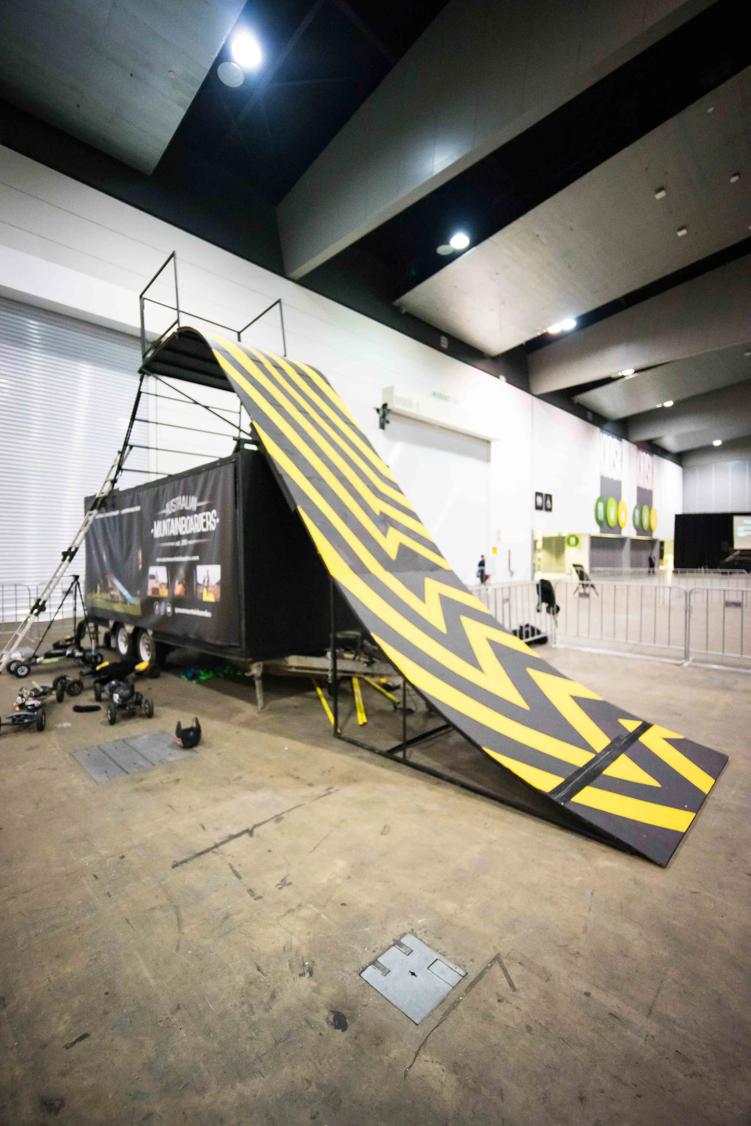 Our Friday was crazy to say the least, once we finally finished the set-up there was something satisfying looking back at the demo ramps set up in all their glory, ready to ride for the next few days. Dylan and the team put significant amount of hours into the portable demo set up a.k.a mobile mountain mega and its new prestige make over. Not only did the ramps get a completely new face thanks to Callum Warren Art it also came along with new curtains thanks to Michael Dyer from Tango Visuals. Dylan issues with me going off script – most of time, were quickly fixed with having everything I needed to know written on the down ramp… little did he remember that well... I don’t abide by all the rules.