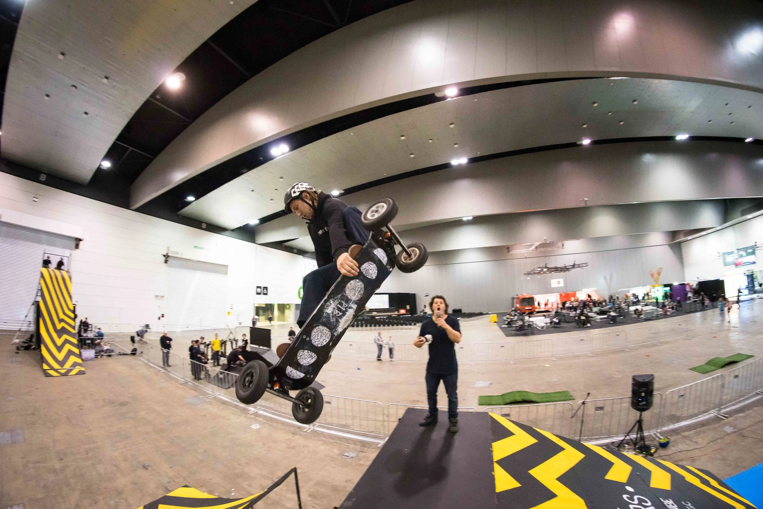 The doors open and the crowd flowed in and we ready for our first show which we were all super psyched for. With a handful, of new and old members I couldn’t wait get this show on the road and to carry on like a pork chop. The first show was great, riding the concrete didn’t seem to be a problem for the guys – it benefited them with the speed they needed. The new addition of the foam roll away after the landing was a great added feature as it gave the guys the security they needed to perform to their best stunts. Along with our usual shenanigans we were well underway. For this show we wanted to give the opportunity to the public of learning to ride nonstop, therefore we opened up the lessons for all day madness – which was a massive hit. It was encouraging to see a wide range of not only kids interested in mountain boarding but the number of adults who were also keen on learning and getting to know the sport we love to demonstrate.