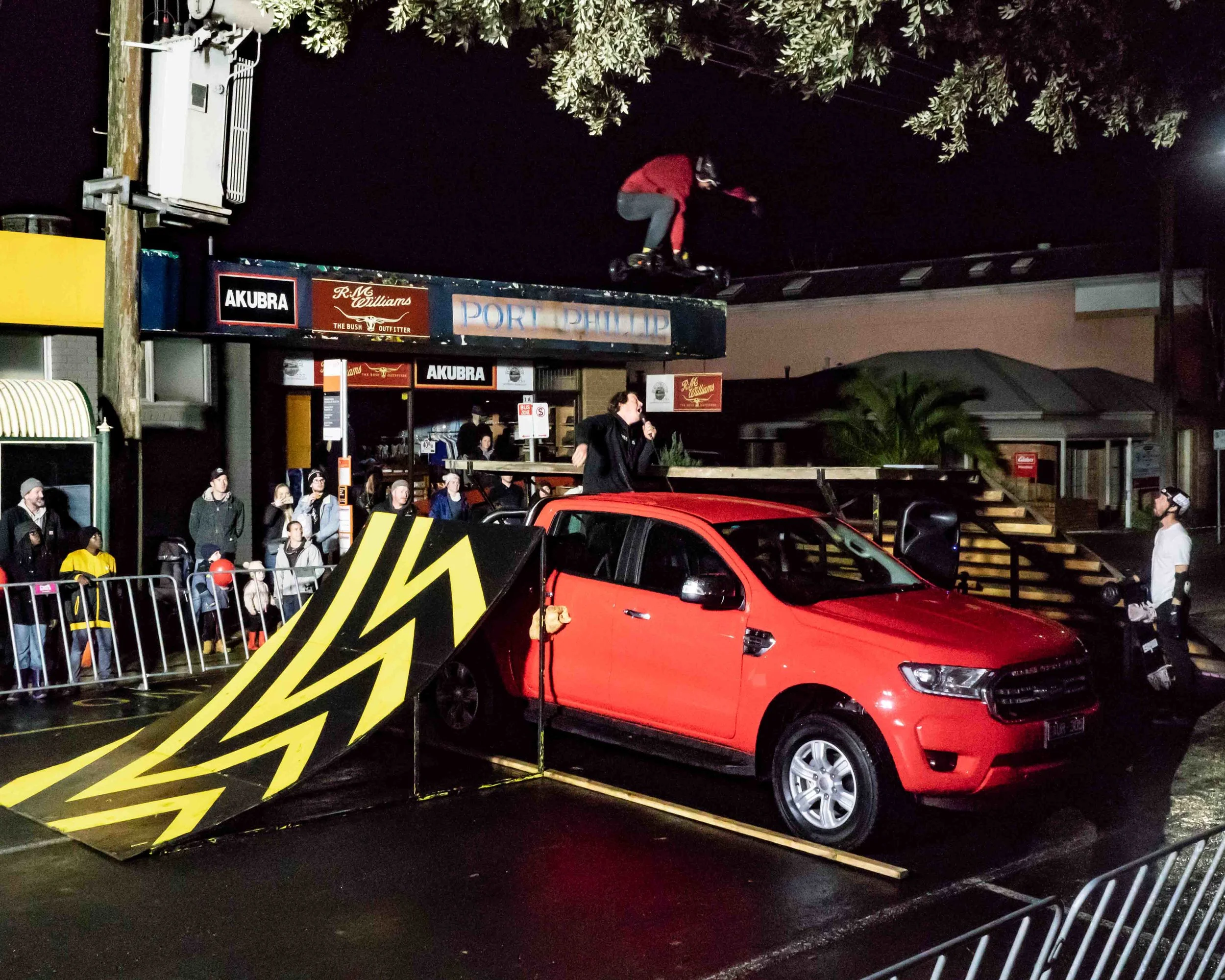 So, after breaking down the ramp and getting all our gear together we set off for Warragul. As I was driving down a very much back road thanks to google, I couldn’t help but notice the skies were turning very grey. As soon as the Ford Ranger pulled in to the main street of Warragul (Thank you Ford Australia for the support) it started to rain. That didnt worry our crew. The ramp was set up quick smart!