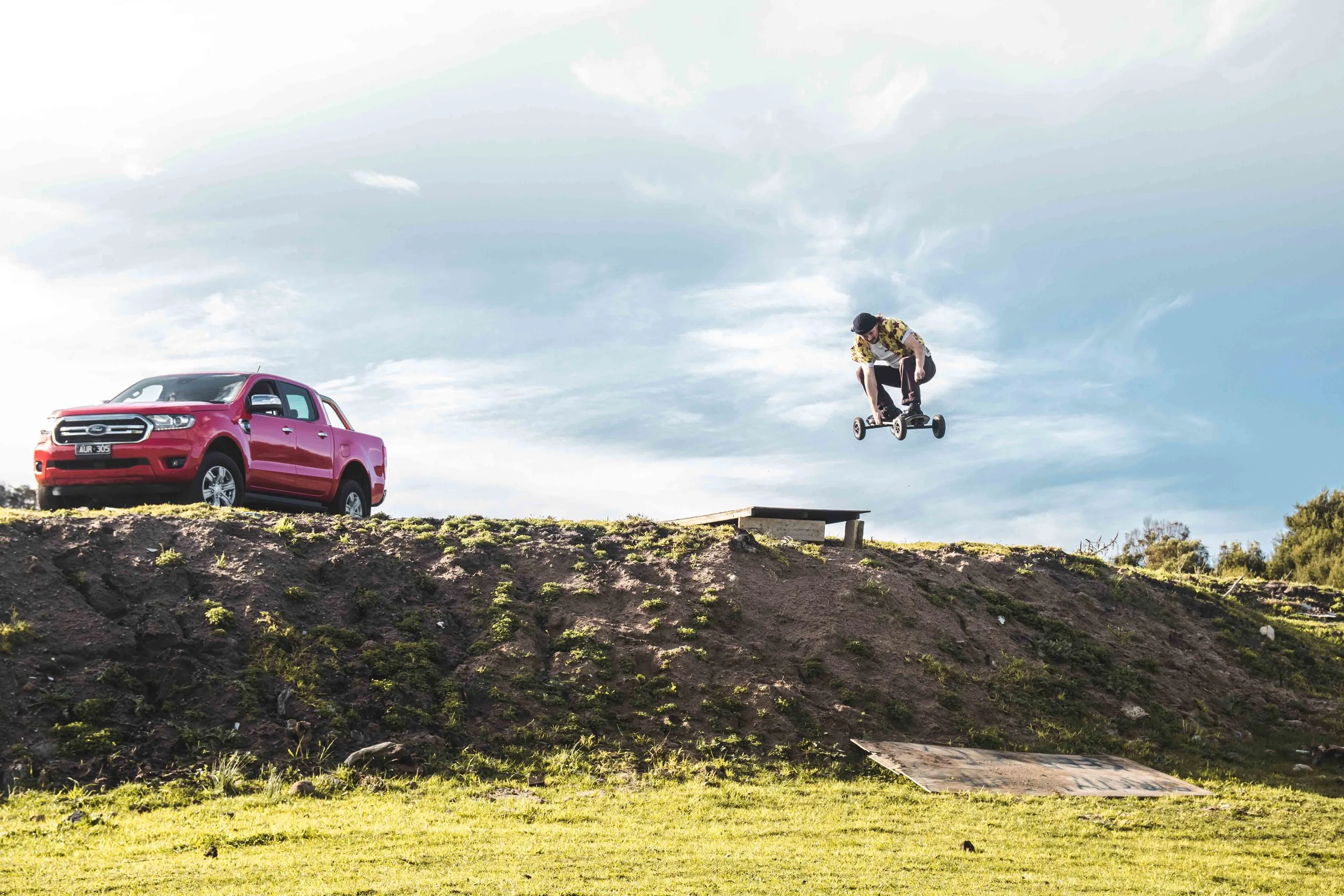 On Sunday I returned back to Ace Hi. The rain had magically disappeared and it was a beautiful day down on the Peninsula. The sun was out, the birds were chirping and it was time to rip some grass with our new Ford Ranger. During the week, as I was sitting on the bobcat making jumps at the Ace Hi Mountainboard Park I drempt up this idea of Wakeboarding in the paddocks of Ace Hi. So on Sunday we rigged up the Ford Ranger with a tow rope and off we went into the back country. Sliding around corners, jumping off cliffs and best of all flying UP hills. It was so much fun. I swear Formo had just as much fun driving the Ranger as he did actually riding. We filmed an awesome video for Instagram which you can check out here and laughed a lot. Another succesful day in Mountainboard town. Check out the video below for a full recap of the weekend: